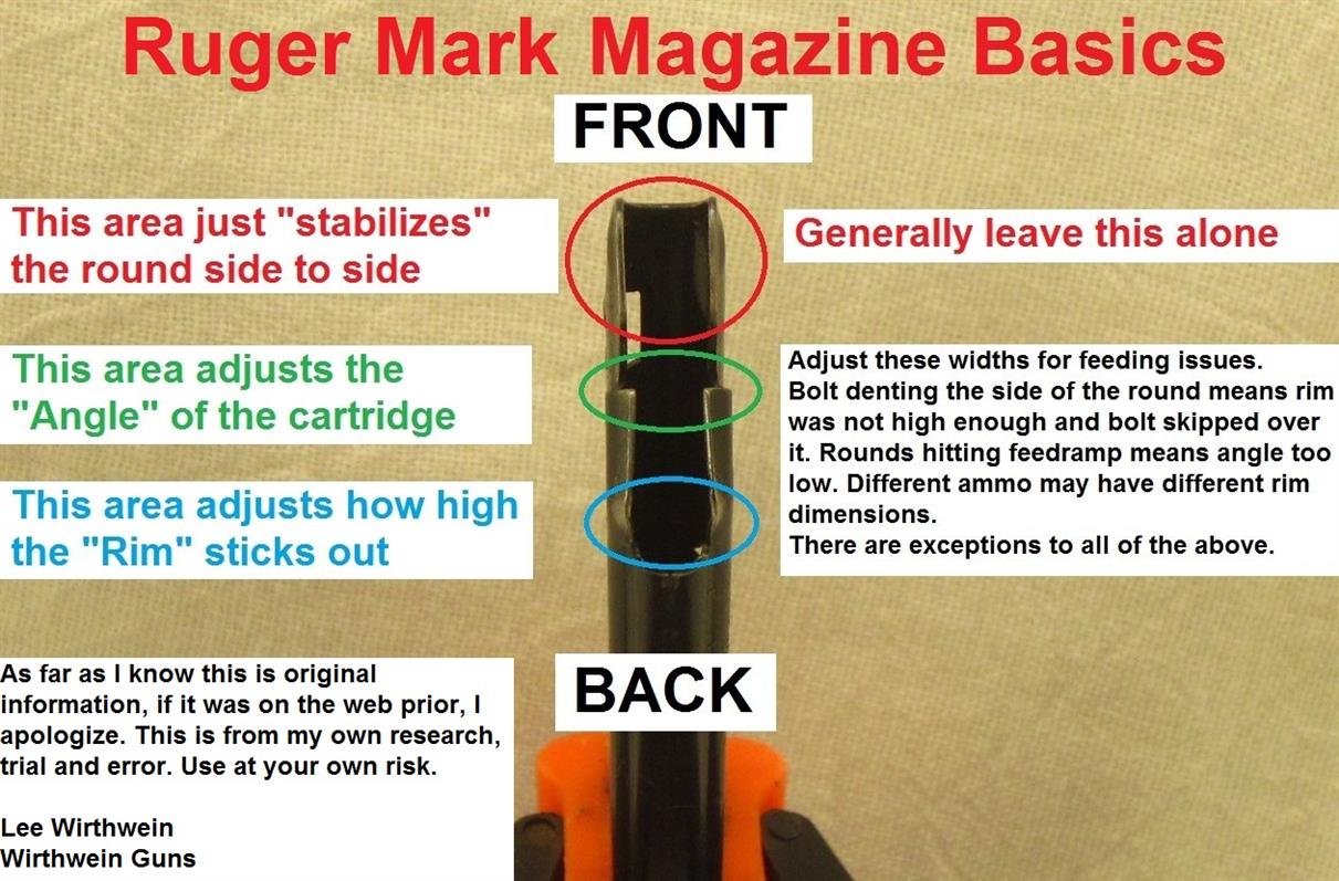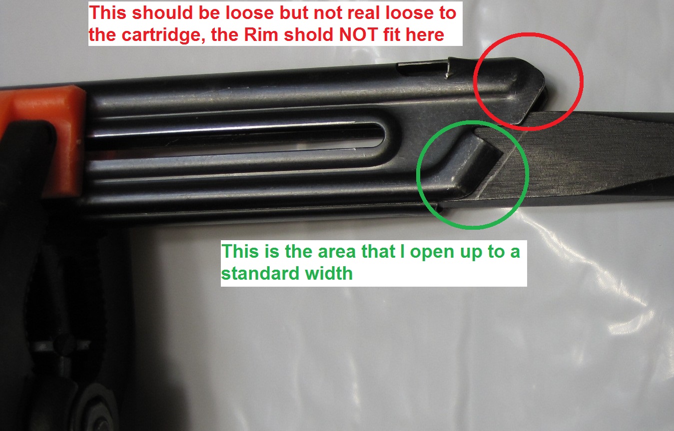 The rear lips control the height and angle of the round. It's a two step procedure to get the feeding correct. The "rear" of the rear lips controls height, open this area to get round higher in magazine so bolt will grab it properly.