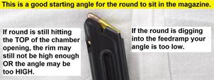The "front" of the rear lips controls the angle of the round, once you open the rear you load a few rounds in the magazine and test how high the nose can go without forcing it. The top of the FRONT lips should land about middle of round and you can adjust angle from there for feeding,, you can tighten or open it to adjust angle.