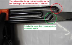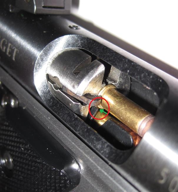 The FIRST picture below shows PROPER clearance (Green Arrow) from Feed Lip to Case Rim. If they were touching the case would be ejected prematurely (prior hitting Ejector) and this could leave the empty case in the chamber after the bolt has cycled causing a "Stove Pipe".