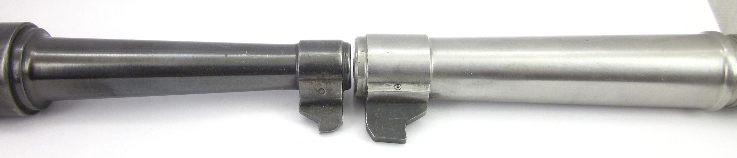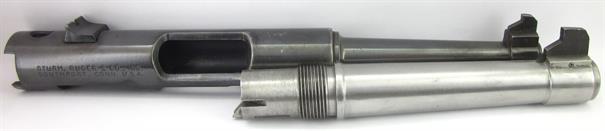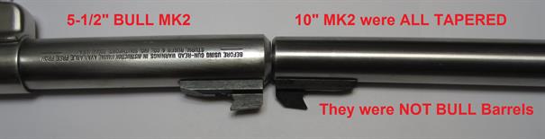 The Heavy Taper Barrels in 5-1/4" and 6-7/8" have a front sight unique to them, the adjustable rear sight is like all other Mark rear sights. The pictures below show obvious differences. The 5-1/4" is collectable and best not messed with.
